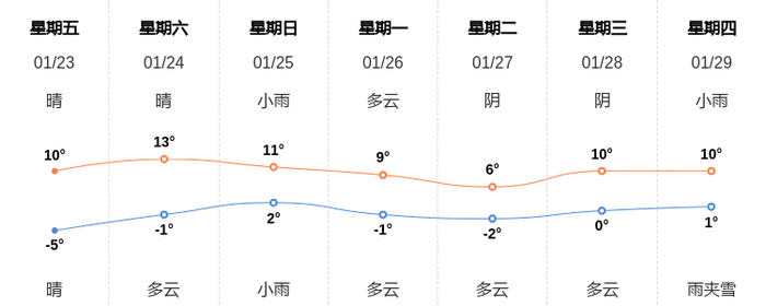 预计今天白天晴,最高气温10℃,东风1级,今天夜间晴,最低气温-5℃,东风1级。