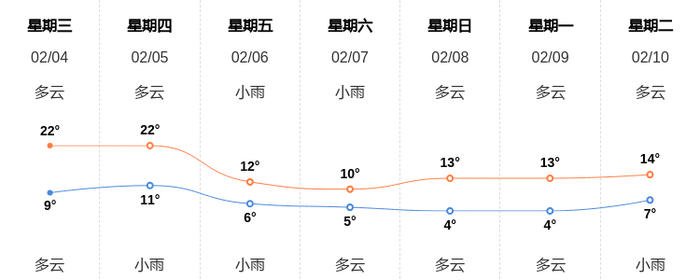 预计今天白天多云,最高气温22℃,西南风2级,今天夜间多云,最低气温9℃,西南风2级。
