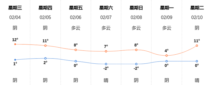预计今天白天阴,最高气温12℃,南风1级,今天夜间阴,最低气温1℃,南风1级。