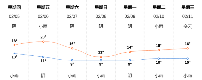 预计今天白天阴,最高气温18℃,东南风2级,今天夜间小雨,最低气温13℃,东南风2级。