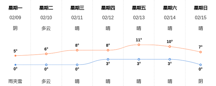 预计今天白天阴,最高气温5℃,南风3级,今天夜间雨夹雪,最低气温0℃,南风3级。