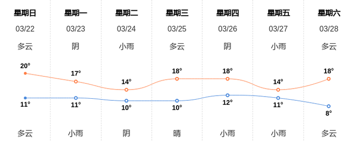 3月22日上海天气早知道 新浪新闻 新浪新闻官方账号 03.2207:16 关注 今天是3月22日星期日,一起来看天气。预计今天白天多云,最高气温20℃,东风1级,今天夜间多云,最低气温11℃,东风1级。空气质量方面,AQI指数40,空气质量为优。空气质量令人满意,充满新鲜空气。