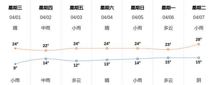4月1日邵阳天气早知道 新浪新闻 新浪新闻官方账号 04.0107:17 关注 今天是4月1日星期三,一起来看天气。预计今天白天晴,最高气温24℃,东风1级,今天夜间小雨,最低气温9℃,东风1级。空气质量方面,AQI指数20,空气质量为优。空气质量令人满意,充满新鲜空气。