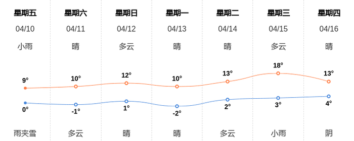 4月10日绥化天气早知道 新浪新闻 新浪新闻官方账号 04.1007:16 关注 今天是4月10日星期五,一起来看天气。预计今天白天小雨,最高气温9℃,西南风2级,今天夜间雨夹雪,最低气温0℃,西南风2级。空气质量方面,AQI指数21,空气质量为优。空气质量令人满意,充满新鲜空气。