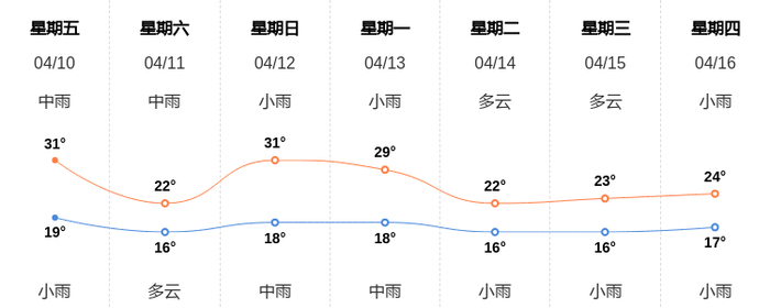 4月10日丽水天气早知道 新浪新闻 新浪新闻官方账号 04.1007:16 关注 今天是4月10日星期五,一起来看天气。预计今天白天中雨,最高气温31℃,东南风1级,今天夜间小雨,最低气温19℃,东南风1级。空气质量方面,AQI指数22,空气质量为优。空气质量令人满意,充满新鲜空气。