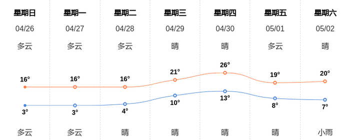 4月26日长春天气早知道 新浪新闻 新浪新闻官方账号 04.2607:16 关注 今天是4月26日星期日,一起来看天气。预计今天白天多云,最高气温16℃,北风2级,今天夜间多云,最低气温3℃,北风2级。空气质量方面,AQI指数22,空气质量为优。空气质量令人满意,充满新鲜空气。