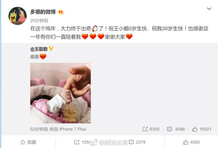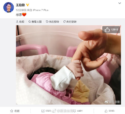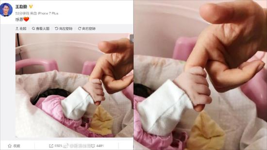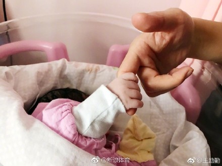 在今天下午将近5点钟时刻,王励勤通过个人微博晒出一张照片,只见图片当中一个小婴儿的小手,紧紧抓住王励勤的一根手指头,如此有爱的小手牵大手画面,也让王励勤配文写道,“感恩