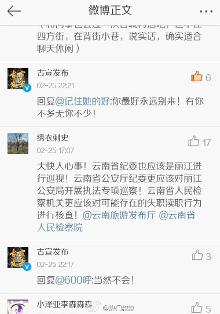 6张今年以来,云南旅游的各种负面新闻也被屡屡曝出。《女子在丽江遭暴打毁容,6名嫌疑人被批捕》、《因催促上菜生口角,丽江游客报警后遭店员暴打尾随》、《云南副省长参团旅游,被购物商店"1对1"强迫消费》等新闻在网络上被疯转。国家旅游局又点名批评丽江。通报称,全国旅游资源规划开发质量评定委员会决定给予丽江古城景区等3家5A级景区严重警告,限期6个月整改。