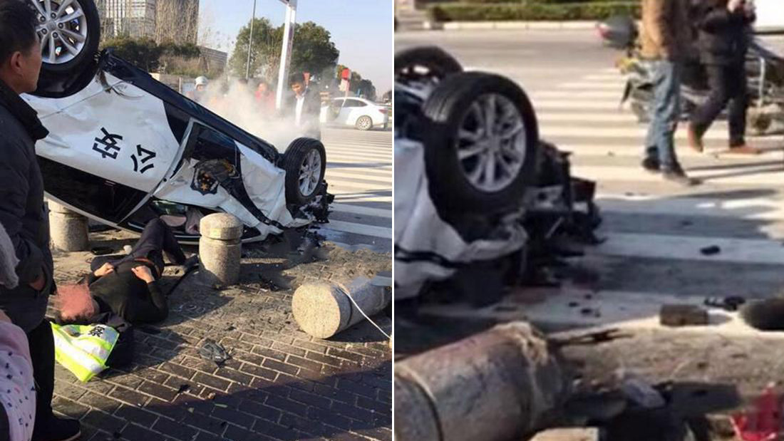 执勤途中遇交通事故 警车被撞底朝天