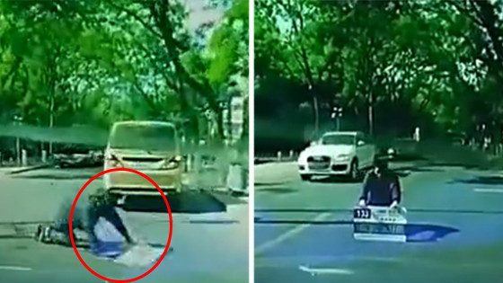 实拍:男子手持公交站牌趴在地上碰瓷