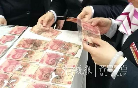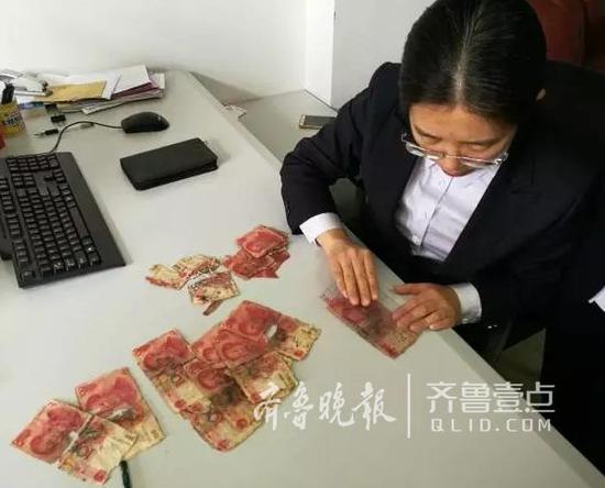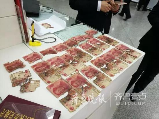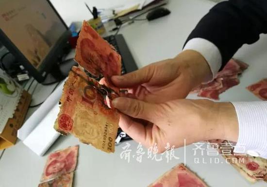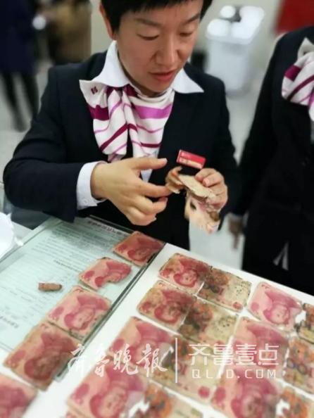 10日,齐鲁晚报记者帮公先生联系上泰安一家商业银行,市政中心支行负责人表示尽量帮他兑换。根据规定,能辨别面额、票面剩余二分之一(含二分之一)至四分之三以下,其图案、文字能按原样连接的残缺、污损人民币,可按原面额的一半兑换。但是为了尽可能多得帮老人兑换,工作人员决定把这些钱送到金库。 11日上午,齐鲁晚报记者和银行工作人员来到金库。工作人员吕学清拿卡尺对残币进行了仔细测量。经鉴定,只有一张票面剩余四分之三以上,其余的碎片均小于二分之一,不能兑换。 吕学清告诉记者,老人当时应该把地里挖出的残损人民币都带来银行,让工作人员处理。现在老人自己剥离的人民币从中间断开,每个经卡尺测量都小于二分之一,连接在一起的钱也无法辨认是不是属于同一张。只给老人挽回了一百元的损失,她们也感觉很遗憾。