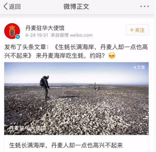 原来这都是因为丹麦大使馆昨天发布的一篇头条文章,文章中提到,目前在丹麦有种生蚝叫做太平洋生蚝,原本是不属于丹麦的海域的。现在,这种新物种入侵到丹麦这片乐土之后,简直无法无天,对海岸的生态环境造成了极大的破坏。