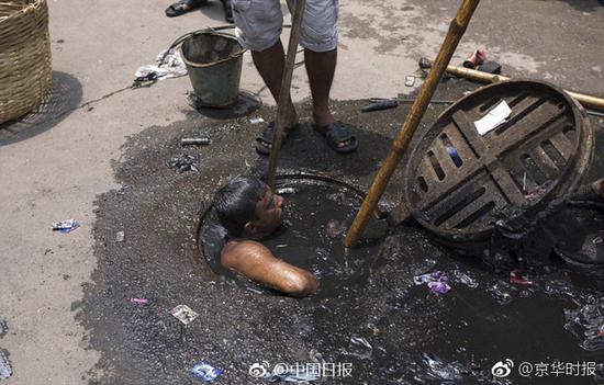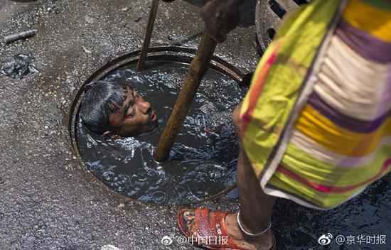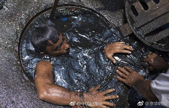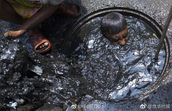 据英国《每日邮报》近日报道,一位来自孟加拉国首都达卡市公司的男员工,在没有任何适当的安全设备的情况下,不得不用长棍子深入地底挖垃圾,而且也没有面罩,只能用粗糙的手捂住口鼻遮挡这些液体污秽物。