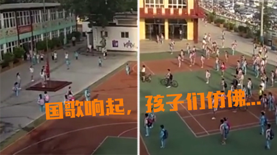 在某小学孩子们正四散走在操场上,而当国歌响起的时候,整个操场像凝固了一样,所有的孩子无论走到什么位置都停了下来,场景令人不由得深深被感动!
