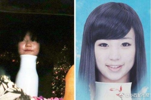 购票后,有人把记者带到了一处房子,门口有专人把守,显得十分神秘。在屋子一角,有一张用砖头垫高的方桌,桌子上有一个方盒子,盖着黑布。随后一名工作人员先是介绍了花瓶姑娘的情况,说她身体残疾,很虚弱,从小被放入花瓶中,可以问问题,但不能碰花瓶姑娘。同时,特别强调严禁拍照。图为撩开黑布后露出的花瓶姑娘,只露出头部。