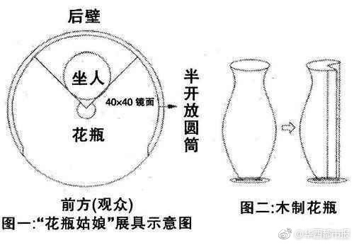 这张图很好的揭示了”花瓶姑娘“骗局。人的下巴放到花瓶口上,再用布幔把四周包围成一个半圆,并把镜子的边缘遮挡住,一个“花瓶姑娘”就诞生了。配上柔弱的灯光,一点儿破绽也看不出来。由于“花瓶姑娘”的身体被镜子挡住,观众看到的人头下面,是两面镜子对半圆布幔的反射影像,看上去花瓶四周都是空间,而人头好像就长在花瓶上。端午假期,外出旅游如果遇到这样的骗局大家一定注意。