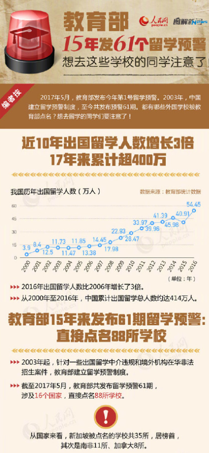 其实在中国教育部发布2017年第一号留学预警前,中国驻泰大使馆教育组已经在其官网上先后多次发布了相关提醒。2003年中国建立留学预警制度,至今共发布预警61期,直接点名88所学校。都有哪些外国学校被教育部点名?请戳第一图集