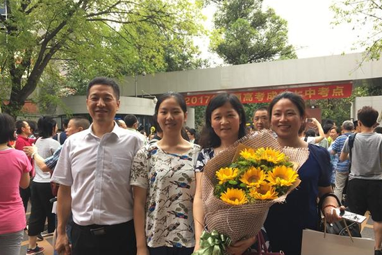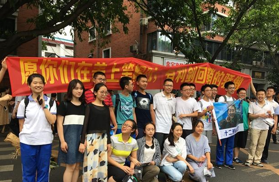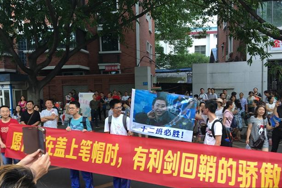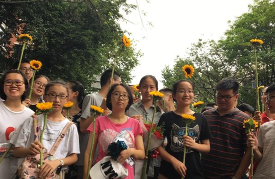11班,必胜!一群家长专门带着向日葵在考场门口喊出了口号,原来举起向日葵寓意夺魁,希望孩子们能在考试中一举夺魁,取得好成绩。成都七中几位已经保送的学生专门带着横幅来迎接本班参加高考的54位同学。下午4点42分记者看到,陆续有考生走出考场,守候在外的考生和家长们已经开始庆祝。