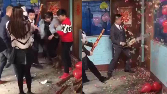 实拍新郎接亲一把推开伴娘 手持电锯锯开房门