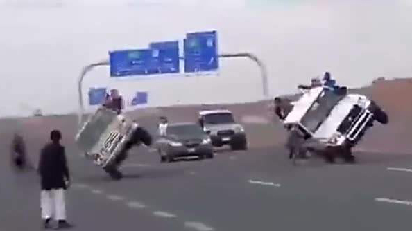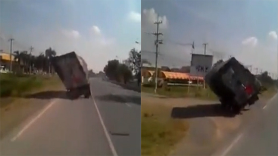 实拍货车超载严重侧倾 歪歪扭扭终于翻车…