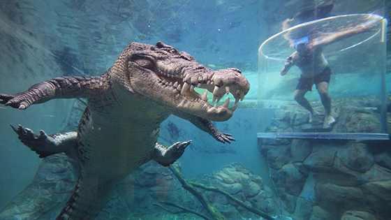 这些鳄鱼都是湾鳄,是23个鳄鱼物种中最大型的,也是现存世界上最大的爬行动物, 雄性湾鳄成年后体长可达6米,牙齿可达10厘米,总之就是非常的可怕!因为水箱透明且薄,刚开始,有的人即便做好了心理准备,还是会紧张。然而,水上还好,真正让人心惊胆战的还是水下的一切。工作人员会给鳄鱼喂食,让它更加靠近水箱,你跟鳄鱼就处在同一个池子里,仿佛它一张嘴就能咬到你,你可以360度清晰得看到鳄鱼的牙齿和皮肤,有时候鳄鱼会直接过来咬笼子!