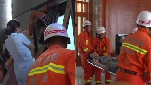 现场分秒必争,消防员使用液压扩张器将电梯轿厢与墙面撑开,经过一分多钟的努力,男子被顺利救出后送医治疗,目前也已脱离险境。