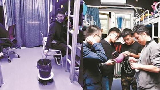 记者注意到,宿舍里的垃圾桶有些与众不同,下边有4个轱辘,“这是我们用遥控车的底盘改造的。”黄晓峰说,他学的专业是产品设计,对于产品的内部构造“门儿清”,他将遥控车的底盘安在了垃圾桶下边,只要按一下遥控,垃圾桶就“随叫随到”了。