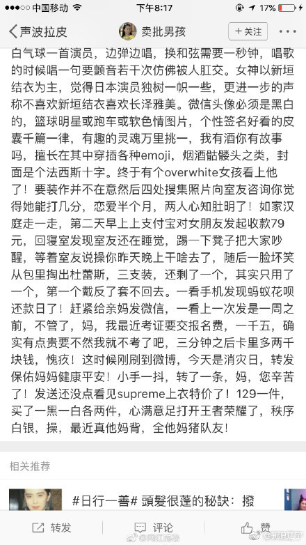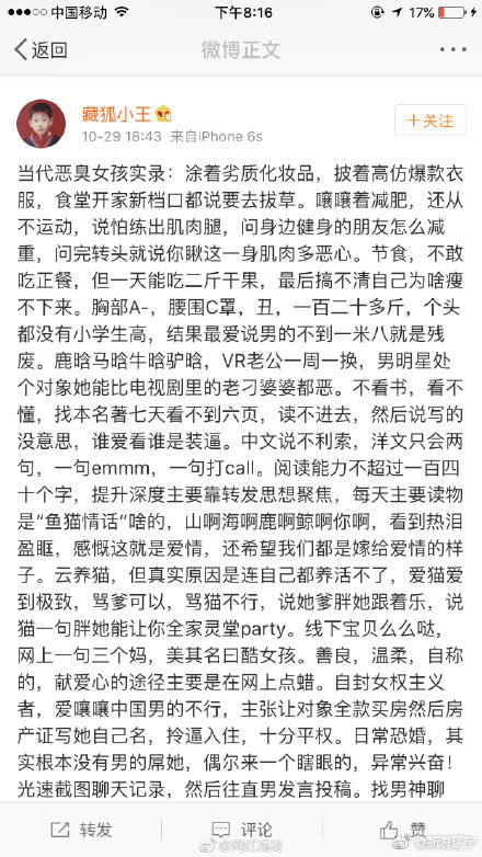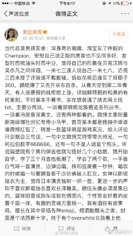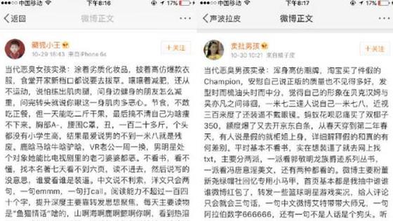 5张中年油腻男成网上最热词汇后,油腻男不服,于是出现了中年油腻女。在这一轮对中年油腻男的diss之后,微博博主藏狐小王发表了一篇名为《当代恶臭女孩实录》的博文,列举了“恶臭女孩”的种种行径,对有这种行为的女生进行了批判。晚上就有女网友发了恶臭男孩的反击,而且很有画面感。
