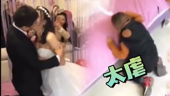 新郎新娘婚床上激吻 围观小男孩崩溃跪倒捶地