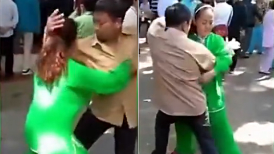 实拍大爷与女子公园练太极 双手乱摸画风奇特