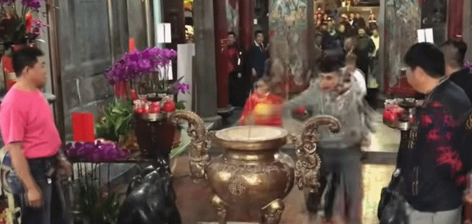 尴尬!百米冲刺抢头香 用力过猛撞翻香炉