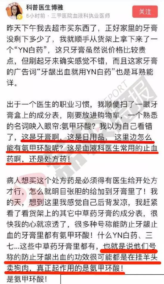 7张10月21日,网名为“科普医生博雅”的网友发表文章称:云南白药牙膏中含有止血功效的西药成分“氨甲环酸”,而不是云南白药,这些所谓防止牙龈出血、止血的“中药牙膏”,其实都是在挂羊头卖狗肉,起到真正作用的,是西药“氨甲环酸”。“科普医生博雅”还质疑,氨甲环酸是处方药,添加到日用品中可能涉嫌违法添加。