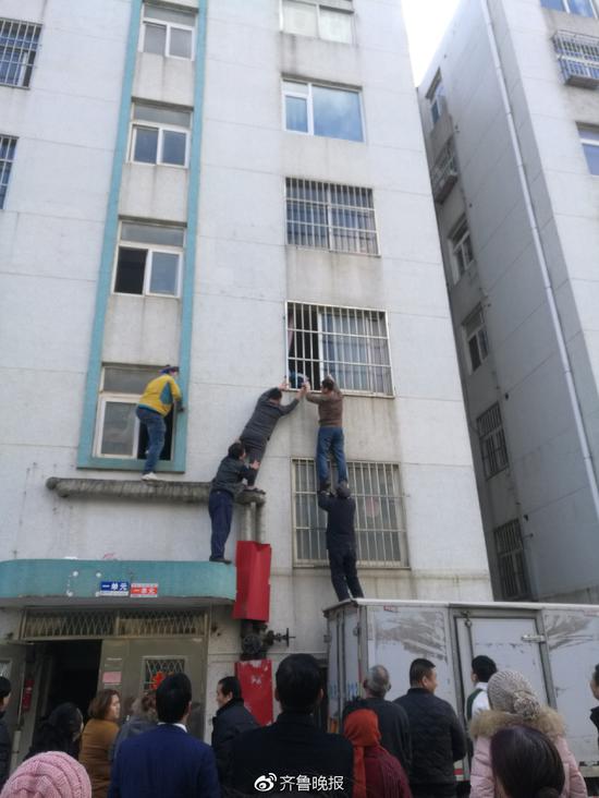 6张小孩的邻居孔艳鲁闻讯后,直接从楼道的窗户爬到楼外,踩在墙外的管道上,一手扒着窗台,一手托着孩子双脚。随后,他的父亲孔祥峰和其他邻居们也从楼道的窗户爬到楼外。孔祥峰和邻居扶住孩子的双腿,同时孔艳鲁用双手托住孩子。