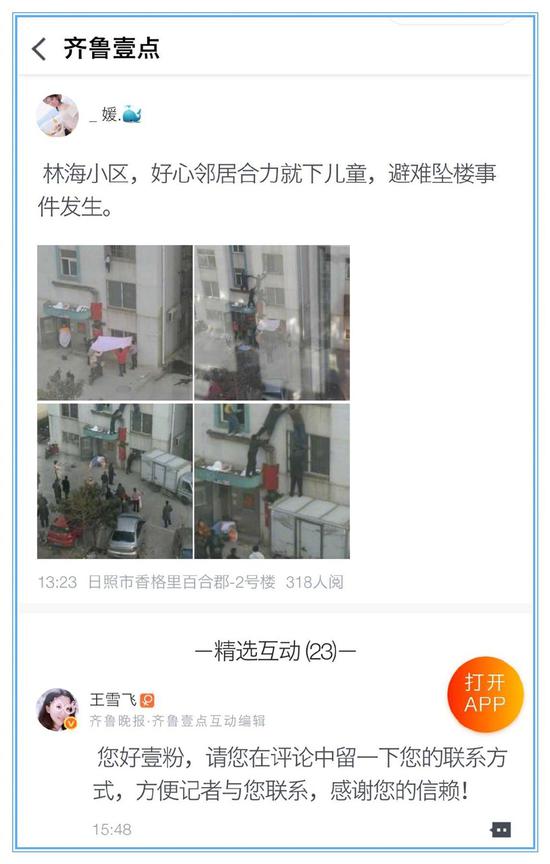 12月14日13点23分,壹粉“媛”向齐鲁晚报新闻客户端齐鲁壹点情报站发布一条图文情报:“林海小区,好心邻居合力救下儿童,避免坠楼事件发生。”齐鲁晚报·齐鲁壹点记者随即赶到日照市东港区石臼街道林海小区,还原这惊心动魄的一幕。