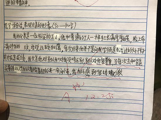 “我的父亲是一位朴实的工人,他和普通工人一样,手上长满厚厚的茧,脸上布满许多(皱)纹,说话比较和蔼,每次回来他并不是问我学习而是生活过的好不好,其次是成绩………每次去和爸爸买菜时,认识的人都会亲切的来一句问候,我为此感到很骄傲。”