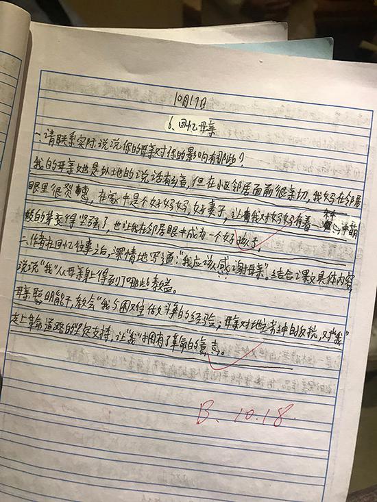 以上是2018年秋季学期,刚刚转学不久、还在读初二的衡南少年罗某在语文作业本上写下的对父母的描述:母亲贤惠,父亲勤劳和蔼。