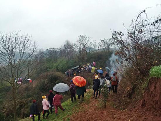 1月4日上午,湖南衡南三塘镇学塘村湾塘组,小雨。被13岁儿子罗某锤杀的谭某某、罗某某下葬。夫妻俩被葬在了罗某家对面的山坡上,离家直线距离不到200米。罗某二婶告诉澎湃新闻,1月3日,家属商量后本来想让罗某来送他父母最后一程。一番联系后,政府相关人员回话,罗某还在配合警方调查,不能来送葬。