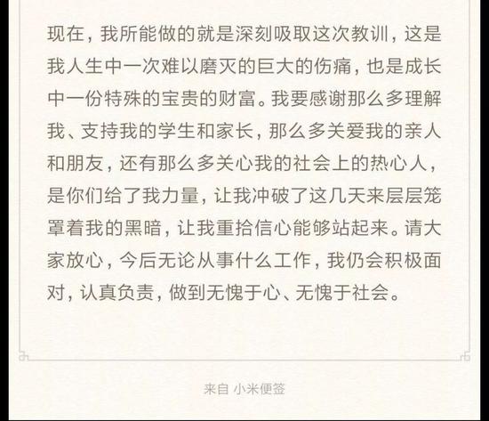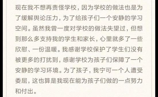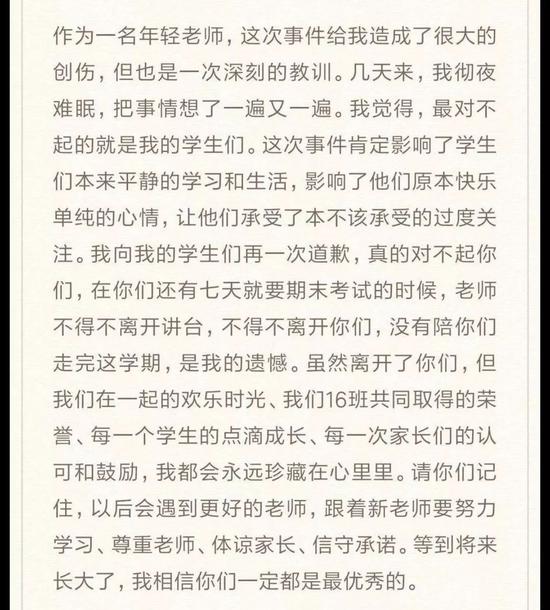 “我向(我的)学生们再一次道歉,真的对不起你们,在你们还有七天就要期末考试的时候,老师不得不离开讲台,不得不离开你们,没有陪你们走完这学期,是我的遗憾。虽然离开了你们,但我们在一起的欢乐时光、我们16班共同取得的荣誉、每一个学生的点滴成长、每一次家长们的认可和鼓励,我都会永远珍藏在心里。”