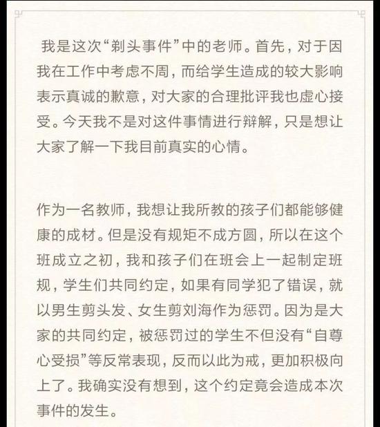 1月20日,当事教师通过其个人微信回应“剃头事件”并发布公开信。
