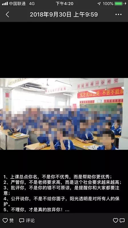 2018年9月30日(应是徐某担任新班级主任后不久),其发表朋友圈:1、上课总点你名,不是你不优秀,而是帮助你更优秀;2、严管你,不是老师要求高,而是这个社会要求越来越高;3、批评你,不是你的错不可原谅,是提醒你和大家都要注意;4、公开说你,不是不给你面子,阳光透明是对所有人的保护;5、不理你,才是真的放弃你……