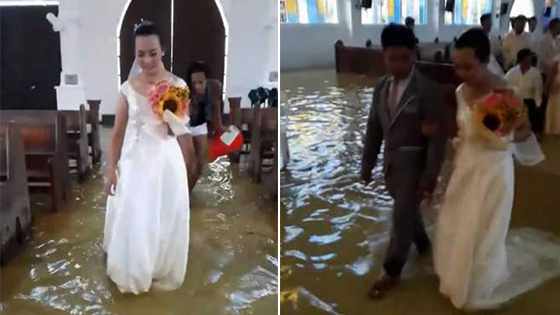 爱情不惧风雨 新人称吉时已到趟水完婚