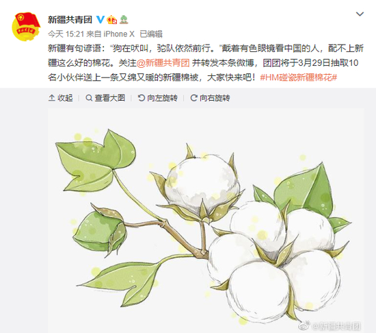 @新疆共青团发布微博称:新疆有句谚语“狗在吠叫,驼队依然前行。”戴着有色眼镜看中国的人,配不上新疆这么好的棉花。关注@新疆共青团 并转发本条微博,团团将于3月29日抽取10名小伙伴送上一条又绵又暖的新疆棉被,大家快来吧!