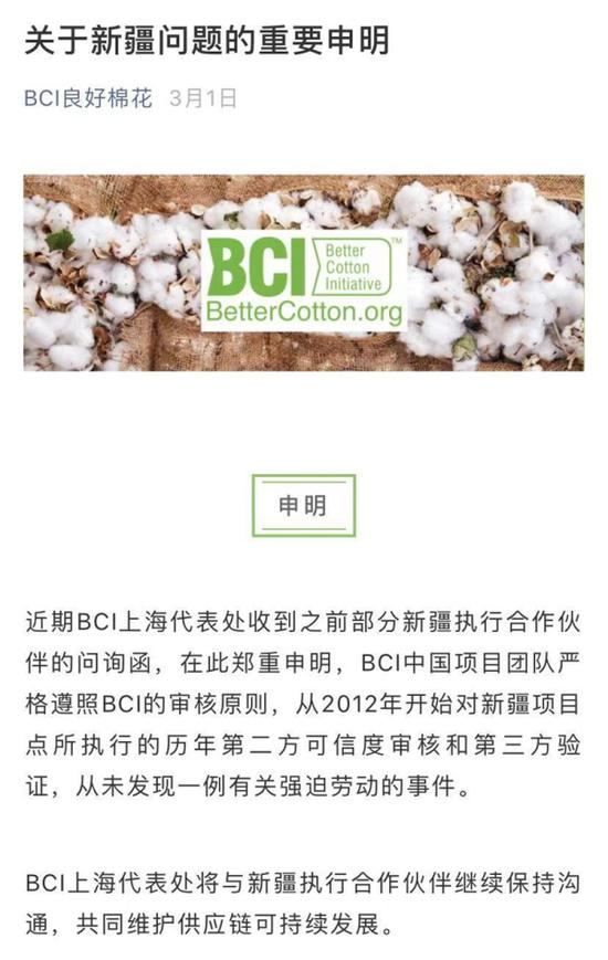 3月1日,“BCI良好棉花”就曾发布“关于新疆问题的重要申明”,澄清有关事实,指出“BCI中国项目团队严格遵照BCI的审核原则,从2012年开始对新疆项目点所执行的历年第二方可信度审核和第三方验证,从未发现一例有关强迫劳动的事件。”