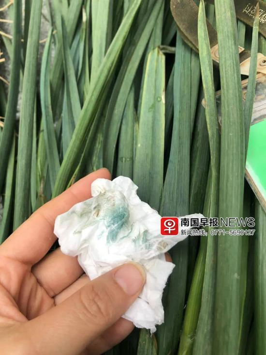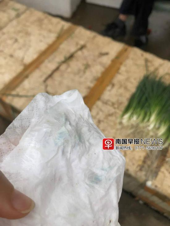 4月7日中午,在海吉星批发市场的一个只有白葱的摊位上,目测上并没有发现葱有异样。然而,用纸巾擦拭后出现了淡蓝色。