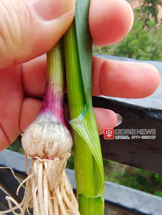 但在另两家卖大蒜的摊位前,陆发军发现,大蒜的茎部有蓝色的液体残留。摊主表示,这些大蒜是批发回来的外地蒜。