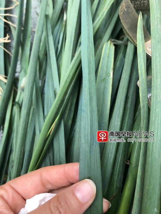 记者看到,多家摊位上的葱蒜从根部到叶,都明显出现蓝色附着物,个别葱叶上甚至还有深蓝色的水渍。