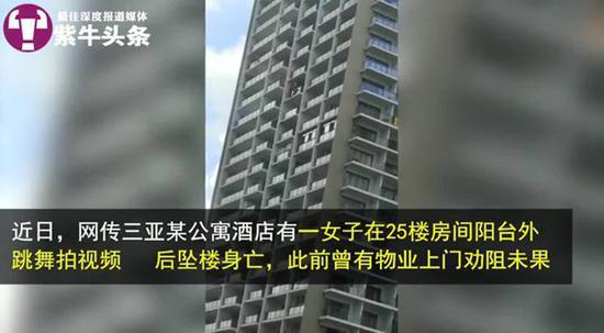 5月6日,网传三亚某公寓酒店有一女子在25楼房间阳台外跳舞后坠楼身亡。网传视频显示该女子身着红色衣服,站在阳台外一只手抓护栏,另一只手高举做舞蹈摇摆动作。