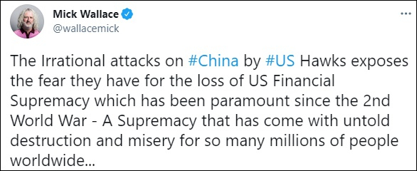 6月18日,这名来自爱尔兰的欧洲议会议员连发两推说:“美国遏制中国崛起的行动继续升级,近乎疯狂——可悲的是,欧盟仍在支持美帝国主义。中国的军事开支‘重在防卫’,而且只有美国的三分之一。中国40年来没有轰炸过任何人,而美国每天轰炸别的国家……”