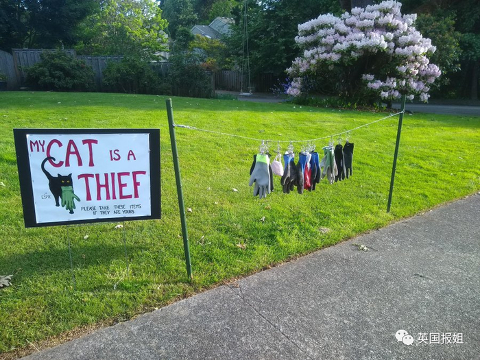 宠物猫爱好偷邻居衣服,无奈主人立牌警告:我的猫是贼,赃物请来这边自取。