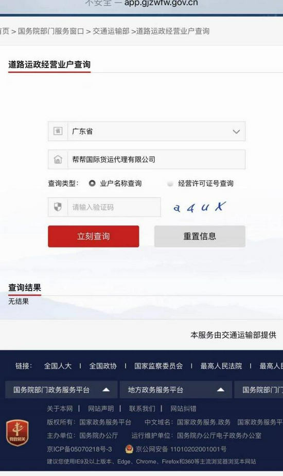 中新网在交通运输部相关查询平台无法查到涉事企业的资质信息。